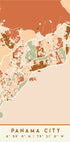 Emiliano Deificus maps the city in rich earth tones and inky blacks: a sleek cartographic portrait of Panama City where coastlines, avenues, and latitude/longitude lines weave a quietly dramatic tapestry. Minimal yet intricate, this urban study brings Pacific contours and metropolitan energy to your walls.