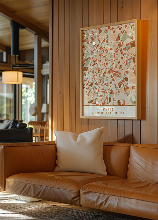 Emiliano Deificus reimagines Paris as a sleek black-on-earth-tone map: the Seine unfurls like silk while boulevards and arrondissements form a refined geometric tapestry. Minimal yet evocative, this urban nocturne invites slow wandering across the city's grids, bridges, and river bends. A subtle compass and coordinates hint at place and memory.