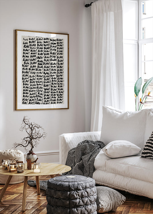 A bold typographic print spelling "Blahblahblah" in crisp, graphic lettering, turning everyday chatter into art. Playful and irreverent, it brings a wink to hallways, offices, or living rooms—a modern statement that anchors minimalist decor and energizes bright, contemporary spaces. Perfect for creative corners and conversation starters.