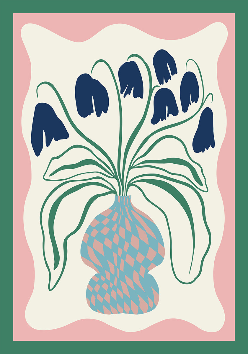 Blessing by Miho Art Studio captures a joyful still life: a terra-cotta vase brimming with bold orange blooms and leafy stems, rendered in a playful, Matisse-inspired, retro 70s palette. Minimal shapes and painterly textures create an uplifting, graphic centerpiece for any room. Sun-washed tones add warmth and a touch of nostalgia.