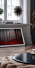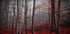 A hauntingly surreal forest scene where the ground is covered in deep crimson leaves, resembling a river of blood. The misty atmosphere and stark tree trunks contrast dramatically with the intense red, creating a dark yet captivating autumn-inspired artwork. Perfect for those who enjoy surreal, atmospheric wall art.