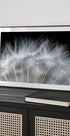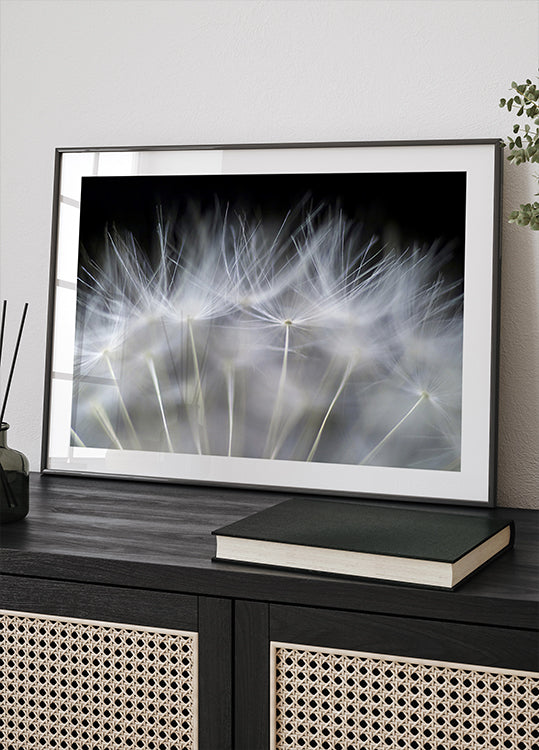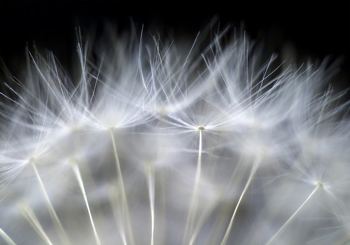A delicate macro photograph of dandelion seeds, capturing their feathery softness and gentle beauty. The close-up perspective highlights the fragile and fleeting nature of these airy tufts.