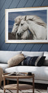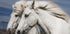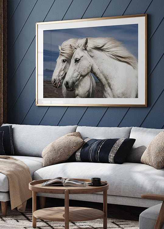A stunning photograph of two white horses with their manes flowing in the wind, symbolizing freedom, tenderness, and companionship. Their graceful presence against the natural landscape captures the essence of romance and friendship.