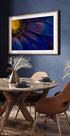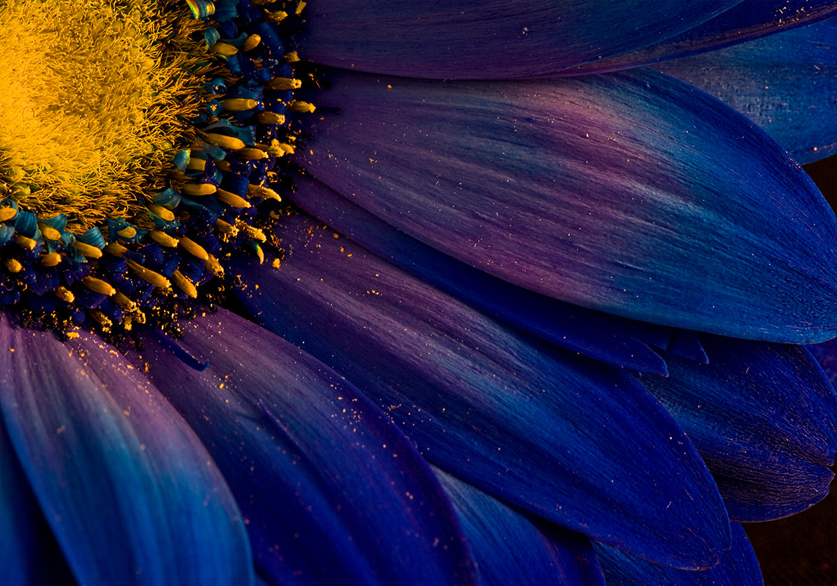 A mesmerizing macro photograph of a flower in deep shades of blue and purple with a vibrant yellow center. The fine details of the petals, pollen, and textures create an intimate and artistic close-up that radiates elegance and summer warmth.