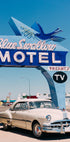 A nostalgic photograph of the iconic Blue Swallow Motel sign on Route 66 in Tucumcari, New Mexico. Featuring a vintage car parked beneath the neon sign, this artwork captures the retro charm of classic American road trips, mid-century motels, and timeless Americana.