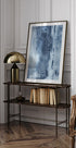 Cool cascades of blue drift in flowing vertical lines, layering soft textures like frost and mist. This contemporary abstract composition pulses with gentle movement, balancing calm and depth. A serene, monochrome statement that suggests icy waterfalls and winter light, perfect for modern, minimalist spaces.