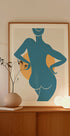 Evoking mid-century modern charm, this artwork portrays a stylized blue woman seen from behind, her graceful silhouette framed by a radiant yellow ground. Crisp geometric shapes and soft curves balance poise and warmth, creating a calm, graphic statement that invites contemplation and elevates contemporary interiors.