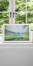 A peaceful scene of a lone boat floating gently on still waters under a cloudy sky. With muted green and blue tones, this tranquil seascape evokes solitude, harmony, and quiet reflection.