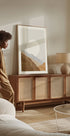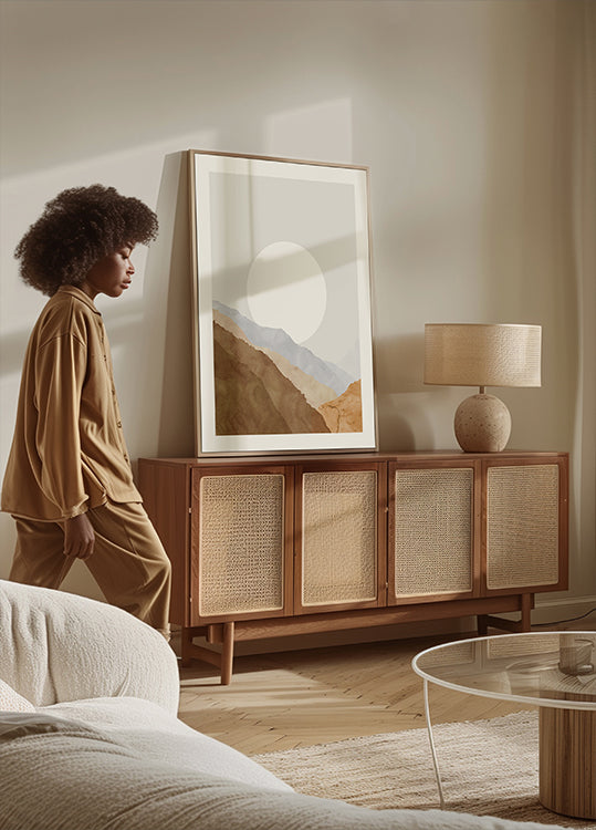 Dreamy and minimalist, this boho landscape layers soft terracotta and sand gradients into rolling mountains beneath a luminous moon and sun. Watercolour textures and gentle neutrals evoke calm, wanderlust, and warm desert light. A serene statement piece by artist Rosana Laiz Blursbyai. Perfect for bohemian interiors and mindful spaces.