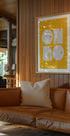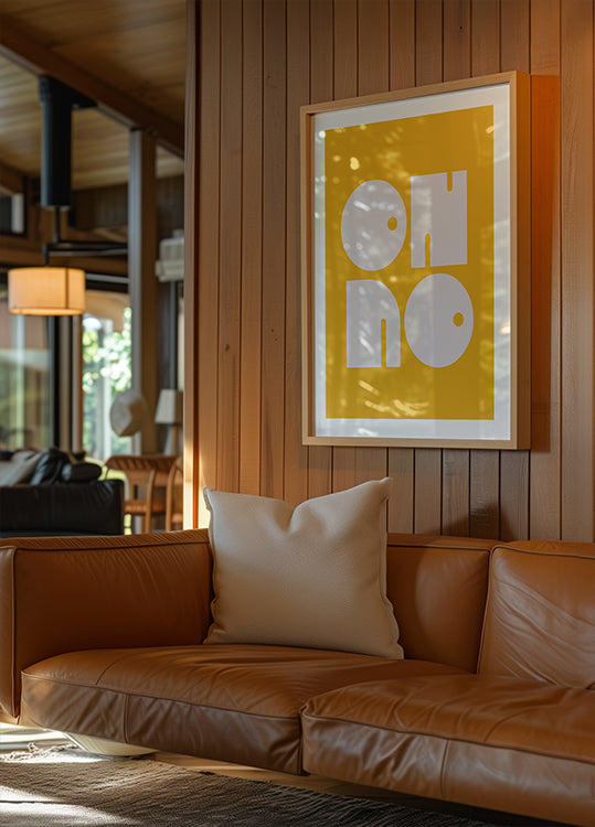 A striking minimalist typography artwork featuring bold geometric shapes spelling out “oh no” in a retro-inspired design. Set against a vibrant yellow background with soft circular forms, this poster blends humor, playfulness, and modern graphic aesthetics, making it a standout piece of contemporary wall art.