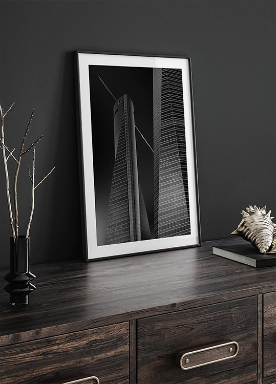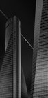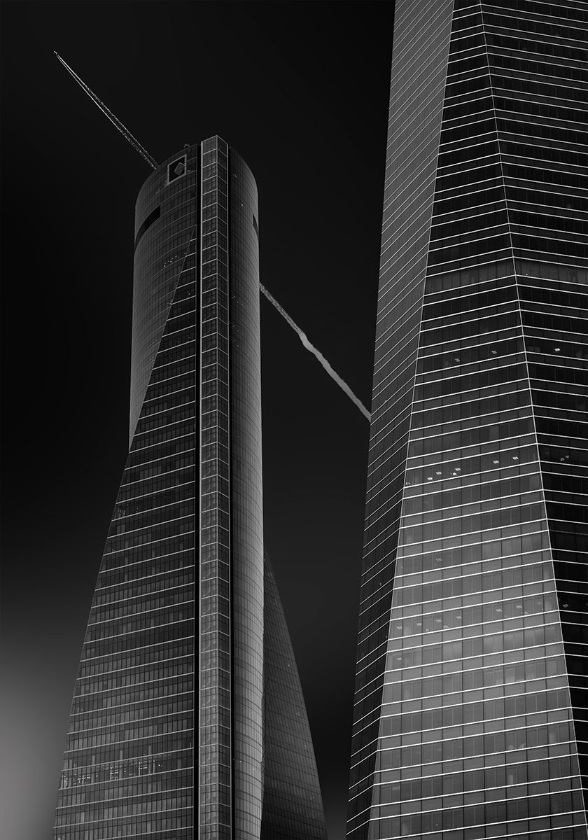 A striking black-and-white cityscape by Jorge Ruiz Dueso: Madrid's Cuatro Torres surge into a pale sky as a plane arcs overhead, capturing the thrill of departure. Stark contrasts, clean geometry, and sweeping perspective turn the CTBA skyline into a cinematic moment of urban ambition. In Spain's capital, it captures motion and modern scale.