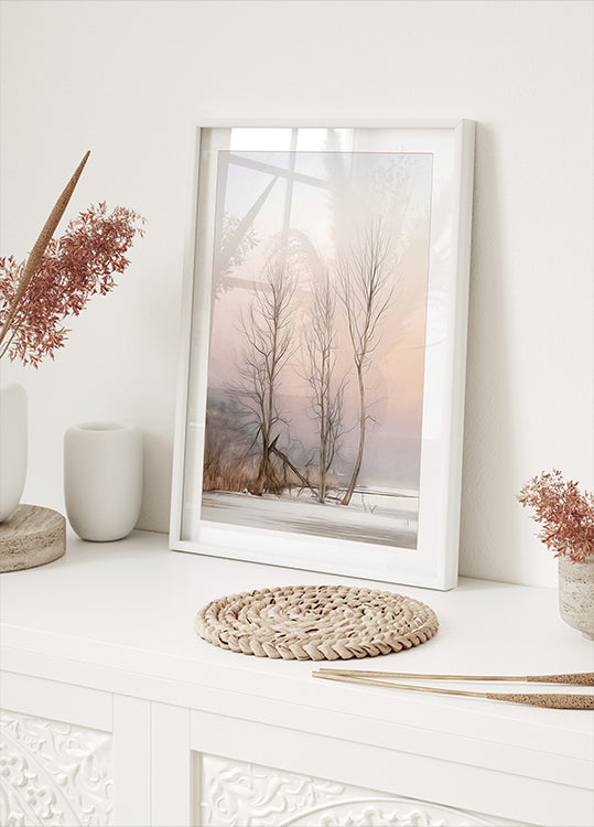A hushed winter lake shimmers under a pale sky as bare trees stand like quiet witnesses to time. Broken Oldies by Gilbert Claes blends moody, painterly impressions with crisp, icy light, evoking snow-dusted silence and atmospheric depth in a graceful vertical composition—serene, modern, and quietly dramatic.