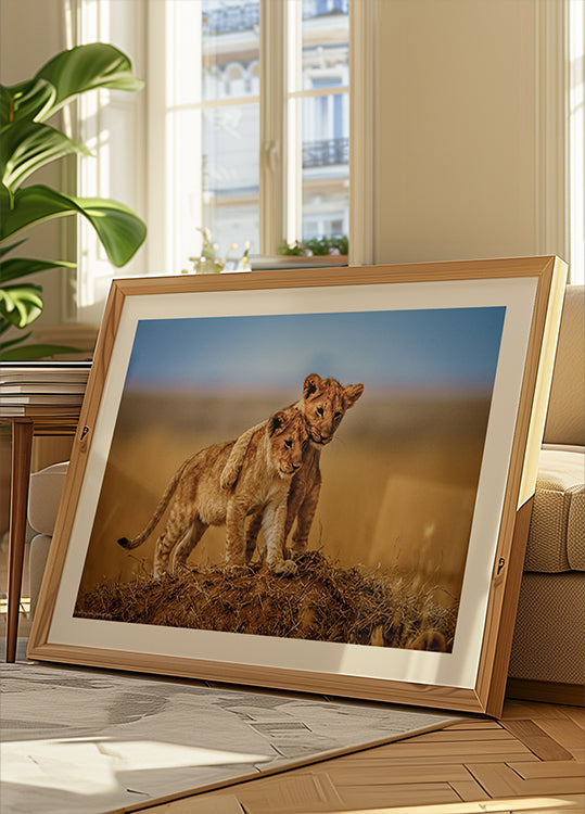 Two lion cubs share a tender embrace on the golden savannah, ears pressed close and paws wrapped in a moment of pure devotion. Brothers in spirit and play, they glow in soft evening light—an intimate glimpse of wild kinship, youthful curiosity, and the fearless love that anchors a pride. A keepsake of sibling bonds in the wild.
