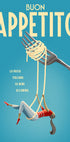 A vibrant and whimsical Italian-inspired poster, featuring a playful illustration of a woman swinging on pasta strands twirled around a fork. With the bold text Buon Appetito, it celebrates the joy of Italian cuisine and its soulful comfort, blending humor and style into an eye-catching artwork.