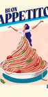 A joyful and playful Italian-themed poster with the bold phrase Buon Appetito. It depicts a woman whose flowing dress transforms into a mountain of spaghetti with tomatoes and basil, blending humor, food culture, and illustration into a delightful and vibrant artwork.