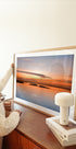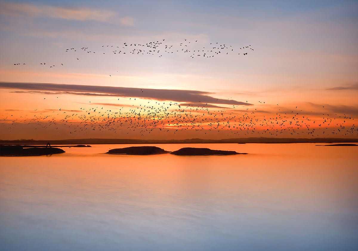A breathtaking long-exposure photograph of a sunset over tranquil waters, capturing a silky smooth surface glowing in orange and pink hues. A flock of birds in graceful flight completes the scene, adding movement and depth to this serene seascape. Perfect for lovers of calm, poetic landscapes.