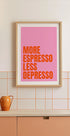 Bright, bold, and humorous – this modern typography poster features the playful phrase "More Espresso Less Depresso" in striking orange text on a pink background. A perfect mix of motivation and fun, it makes a stylish addition to kitchens, offices, or coffee corners. Ideal for coffee lovers with a sense of humor.