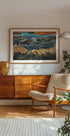 A breathtaking aerial view of California’s desert landscape, showcasing the natural artistry of streams and deltas across sand dunes. The intricate vein-like patterns in blue and gold create an abstract masterpiece, blending earth and water in harmony. A striking piece of photographic wall art for modern interiors.
