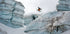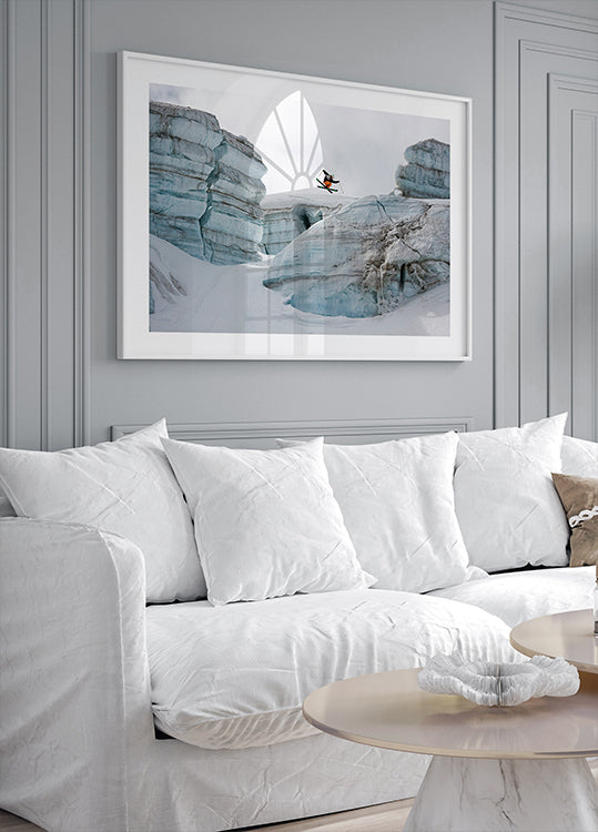 A breathtaking action shot of freestyle skier Candide Thovex soaring through the air between massive icy glaciers. Captured in Chamonix, France, this image embodies adrenaline, skill, and the daring spirit of winter sports. The frozen landscape and gravity-defying leap make it an iconic tribute to adventure and extreme skiing.