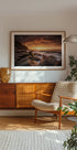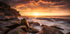 Sunrise ignites Cape Solander, Sydney, in molten gold. Long-exposure waves soften into silk as they wash over rugged sandstone ledges, while a dramatic, cloud-laden sky broods above. Powerful yet tranquil, this seascape freezes a fleeting moment where ocean energy and dawn’s calm meet in luminous balance.