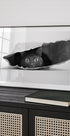 A humorous black-and-white photograph of a curious cat peeking out from a paper bag with wide, surprised eyes. The playful expression and minimalist setting make it a charming and witty piece for cat lovers.