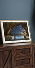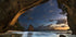 A breathtaking view of Cathedral Cove in New Zealand, captured through the natural rock arch framing the ocean at twilight. The serene waves, glowing reflections, and starlit sky create a magical atmosphere, perfect for bringing coastal beauty and tranquility into your home.