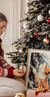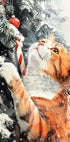 Whiskered mischief meets holiday magic in Cats Love the Christmas Tree by artist Justyna Jaszke. Playful kitties weave around a sparkling fir, batting bright ornaments and candy-like baubles amid soft snowfall. A whimsical watercolor scene that captures cozy winter cheer and feline curiosity. Warm oranges and winter greens lend seasonal charm.