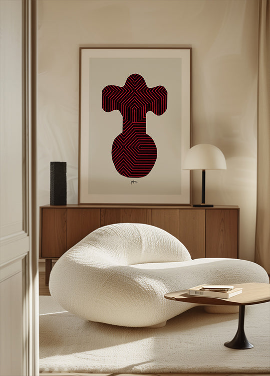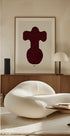 Paulina Vårregn’s Celestial Garden II (red) stacks totem-like shapes in deep crimson, balanced by soft curves and fine lines. Suns and moons hover like quiet orbits, forming a serene, mid-century-tinged composition that brings calm energy, symmetry, and a contemplative glow to contemporary spaces. Ideal for modern interiors.