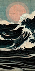 A dramatic Japanese-inspired wave artwork with a textured vintage style. The powerful ocean waves rise beneath a muted sun, blending heritage art traditions with modern Japandi aesthetics. Perfect for lovers of seascape and traditional wave paintings.