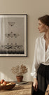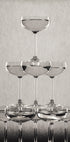 An elegant tower of crystal coupe glasses rises in perfect symmetry, captured in rich black-and-white. Champagne spills from tier to tier, catching the light and casting sleek reflections on a minimalist backdrop. A timeless still life that bottles the thrill of celebration with vintage glamour and modern poise.