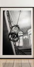 A timeless black and white photograph capturing the elegance of a Parisian interior, with a grand chandelier suspended above a sweeping staircase. The intricate ironwork and architectural details highlight French sophistication and artistry, making this piece perfect for lovers of classic European decor.
