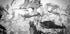 A dramatic black and white photograph capturing a flock of cranes in mid-flight, their wings spreading in chaotic elegance through mist and haze. The dynamic composition conveys both the grace of migration and the raw intensity of nature, making it a striking statement piece for modern interiors.