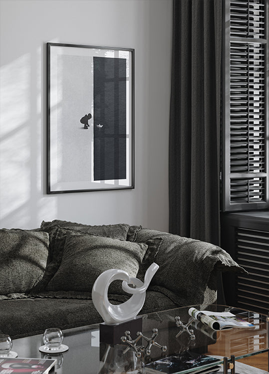 A striking and symbolic artwork featuring a child crouched on the edge of a stark black-and-white division, watching a delicate paper boat float away. This high-contrast minimalist composition evokes themes of childhood wonder, separation, and contemplation. A perfect piece for modern interiors, conceptual art lovers, and those who appreciate thought-provoking designs.