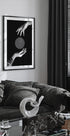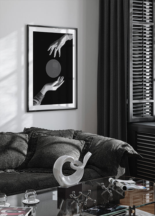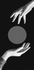 A striking monochrome collage where elegant hands emerge from a deep black field, balancing a luminous sphere and stacked rings. Graphic circles orbit like halos, blending fashion poise with mid-century minimalism. Stark contrasts and smooth geometry create a calm, contemplative rhythm. An enigmatic portrait that invites slow looking.