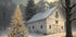 A tranquil snowy winter scene with a white barn, soft falling snow, and a glowing evergreen tree lit with warm fairy lights. The balanced composition and muted tones create a peaceful holiday mood — classic, cozy, and perfect for winter decorating.