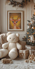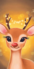 A sweet, whimsical reindeer portrait with glowing fairy-light antlers and a warm golden background. The soft illustration style and gentle smile make it playful yet cozy — ideal for holiday decor, especially in family spaces or cheerful winter gallery walls.