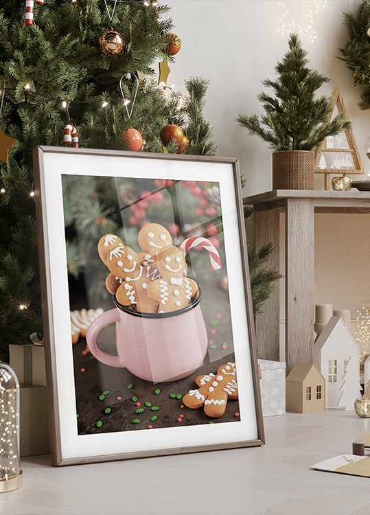 A delightful festive composition featuring a pink mug filled with cheerful gingerbread men cookies decorated with white icing. A classic red-and-white candy cane adds a sweet touch to the holiday charm. The cozy background of pine branches and red berries enhances the Christmas spirit, making this image perfect for seasonal decor or gift ideas.