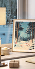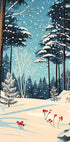 A peaceful winter illustration of a snowy forest with tall pine trees and falling snowflakes. Red berries add a festive touch to the serene landscape, making it perfect for Christmas and holiday decor.