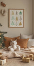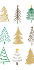 A modern minimalist illustration featuring a collection of abstract Christmas tree designs in green, gold, and brown. Each tree has a unique hand-drawn style, perfect for holiday decor and festive wall art.