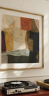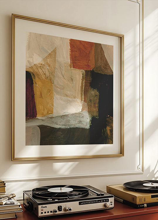 Cinder by Dan Hobday is a poised abstract: velvety browns and burnt-orange strokes drift across a warm beige ground, evoking embered heat and soft shadow. Gentle, painterly forms balance calm and movement, bringing a grounded, modern mood that suits neutral palettes, Japandi spaces, and serene living rooms.