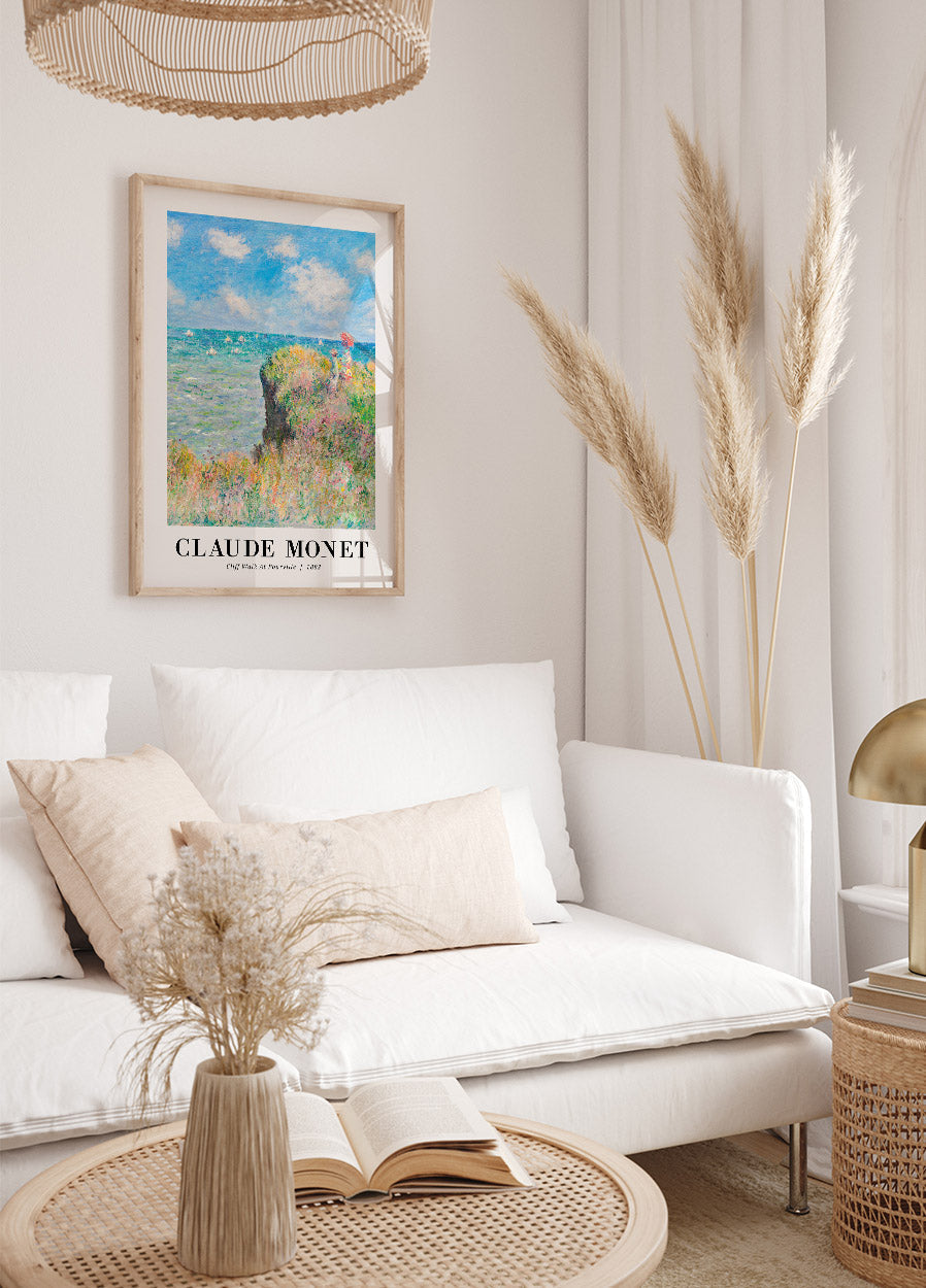This poster features Claude Monet's painting "Cliff Walk at Pourville" from 1882. It showcases a serene coastal scene with vibrant greens and blues, depicting figures on a cliff overlooking the sea. The lively brushstrokes capture the movement of waves and the playful sky, embodying Monet's Impressionist style and his fascination with light and nature.