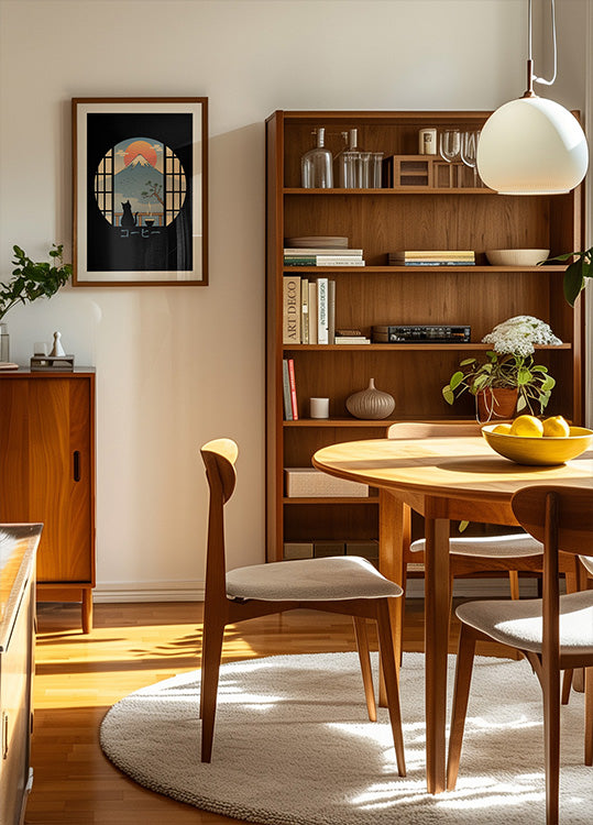 A serene vignette by artist Vincent Trinidad: a coffee-sipping cat gazes from a window as dawn washes Mt. Fuji in soft pastels. Retro-Japandi tones, clean silhouettes, and rising steam evoke quiet mornings, wanderlust, and cozy ritual—perfect for cat lovers, coffee devotees, and Japan daydreamers everywhere.