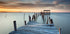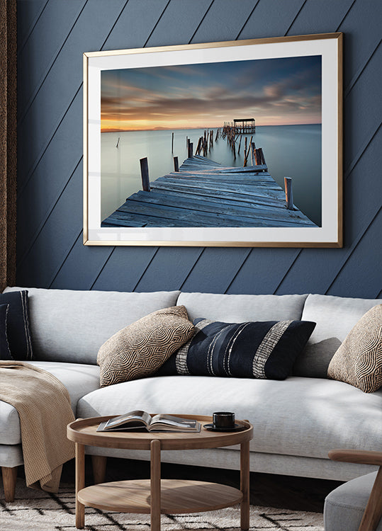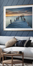 Embrace the quiet drama of a forgotten pier at Carrasqueira, Portugal. Weathered planks and leaning poles fade into silky twilight waters, captured with a long exposure that smooths the sea and deepens the dusk. This evocative seascape by artist Rui David balances decay and serenity in striking perspective.
