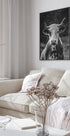 A striking black and white photograph of a cow with a bell around its neck, gazing directly at the camera. The cow's expressive face and prominent horns are highlighted, while droplets of water can be seen falling around it, creating a serene yet dynamic atmosphere. The rustic charm of the image evokes a pastoral setting, celebrating farm life.