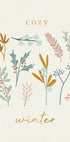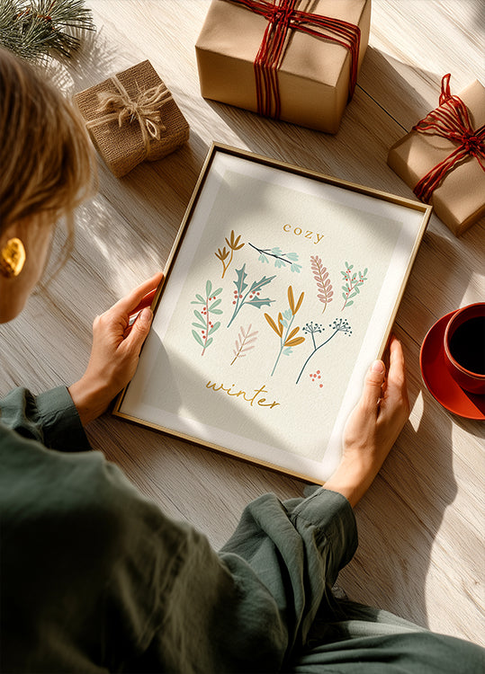 Embrace the hush of the season with Cozy Winter by Goed Blauw: a delicate botanical illustration pairing hand-lettered typography with frosted leaves and subtle golden accents. Soft pastel tones and gentle snowflakes create a calm, festive mood—perfect for inviting warmth on crisp winter days at home.