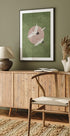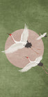 Cranes in Flight by artist Emel Tunaboylu captures a tranquil skyscape where elegant cranes sweep across a soft horizon. A subtle circular motif and a Japandi palette of blush pink and muted green create balance and calm, celebrating grace, movement, and the quiet poetry of nature. Perfect for serene, minimalist interiors.