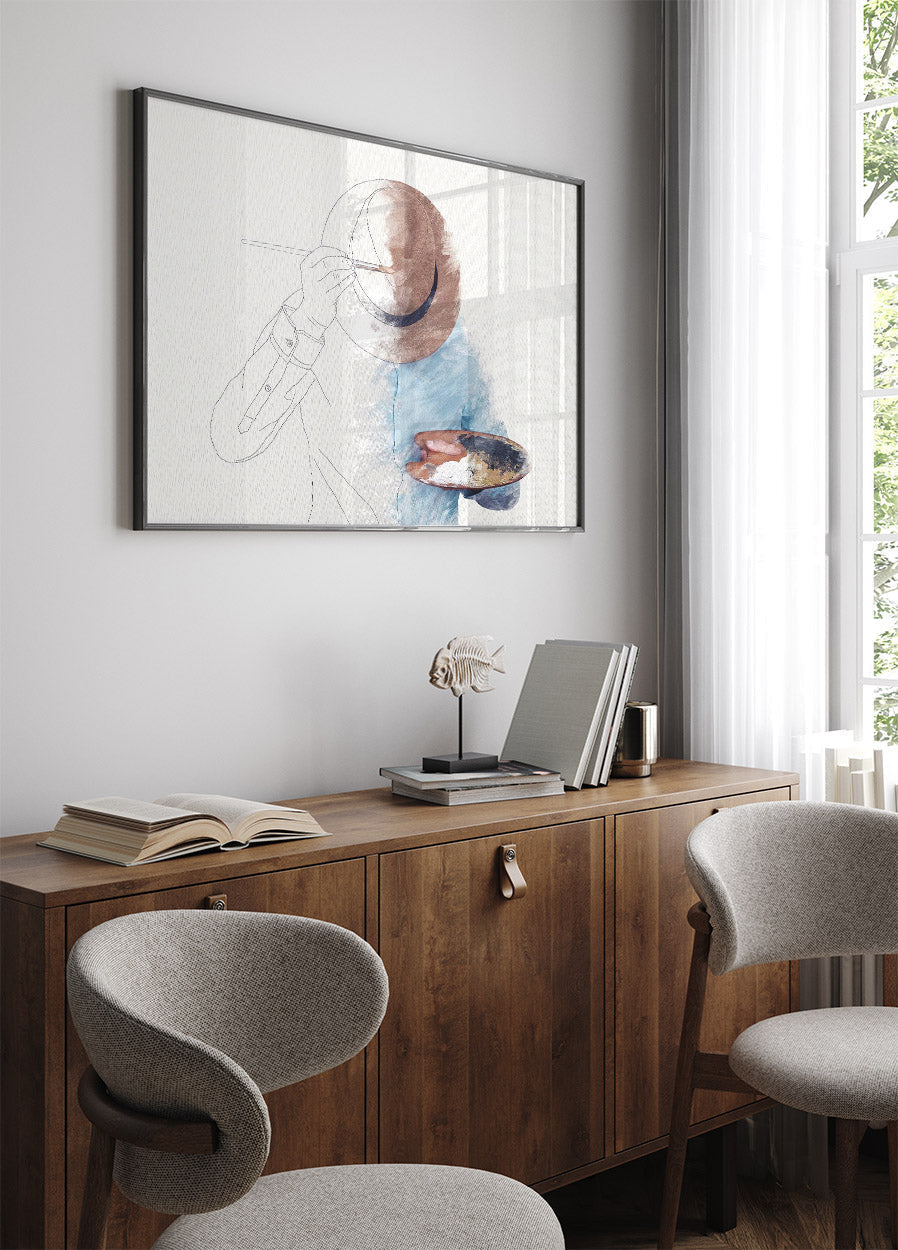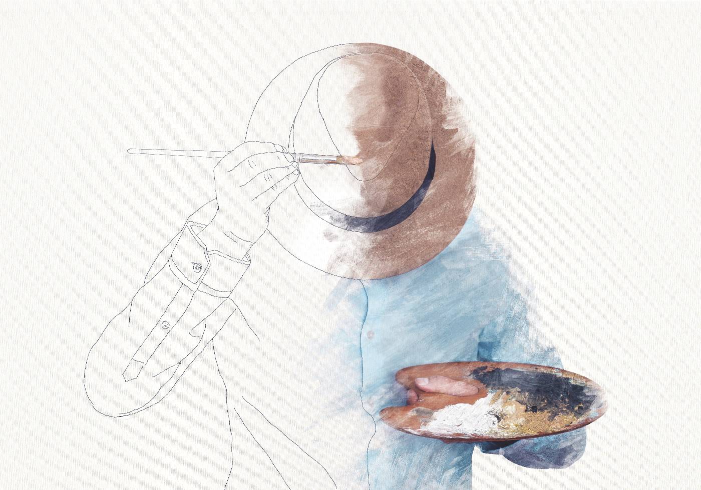 The poster features a surreal representation of an artist painting himself. The figure is partially completed, with a soft, ethereal quality. He wears a broad-brimmed hat and holds a painter's palette, blending colors that suggest identity and self-expression. The use of light and color creates a dreamlike atmosphere, blurring the boundaries between the artist and his creation.