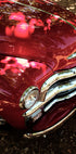 A striking close-up of a vintage Chevrolet in deep crimson red, showcasing its gleaming chrome details and polished curves. This nostalgic automotive photograph captures the elegance of classic cars from the 1950s, reflecting sunlight and surroundings on its glossy surface. Perfect for car enthusiasts, collectors, and lovers of retro design.
