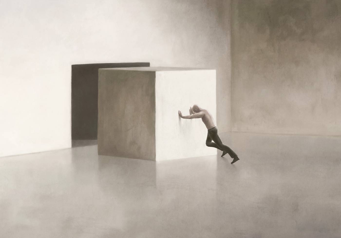 A striking minimalist artwork depicting a lone figure pushing against an enormous cube. This surrealist composition symbolizes struggle, perseverance, and the challenges we face in life. A perfect print for those who appreciate deep, thought-provoking art with a contemporary aesthetic.
