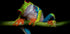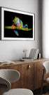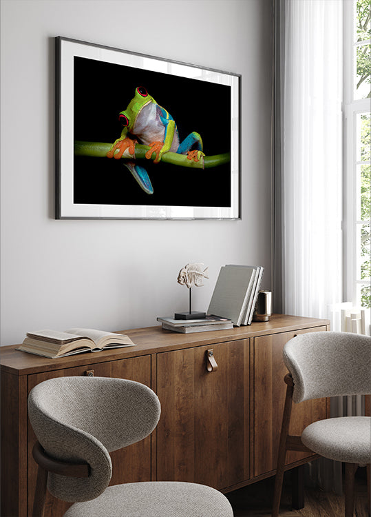 Curiosity by Ferdinando Valverde captures a striking nocturnal encounter: a red-eyed tree frog poised on bamboo, its scarlet gaze and emerald skin glowing against deep shadow. Macro detail reveals delicate toes and dewy texture, evoking a quiet, watchful tension and the playful wonder of a jungle night.